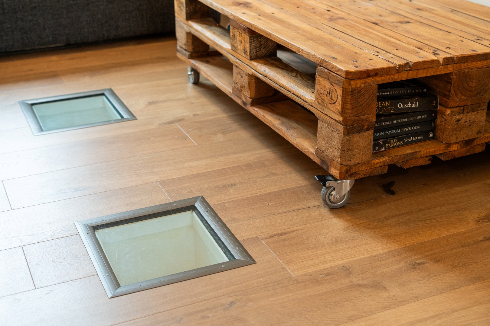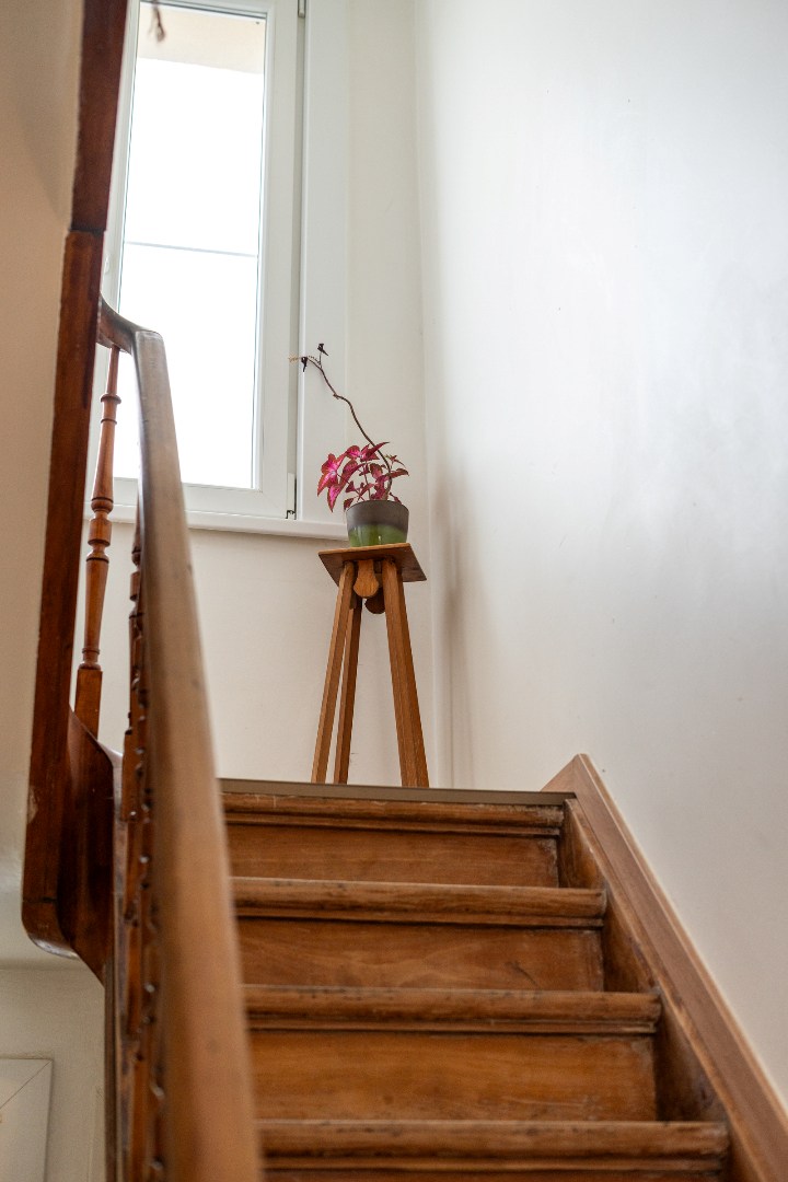 Een uniek element zijn de kleine lichtkoepels tussen het gelijkvloers en de sous-sol die zorgen voor een speels effect én extra lichtinval. Verder zijn er op dit verdiep een ruime badkamer met ligbad, een handige berging met wasmachine-aansluiting en toegang tot de gezellig aangelegde stadstuin – ideaal voor een barbecue of aperitiefmoment.